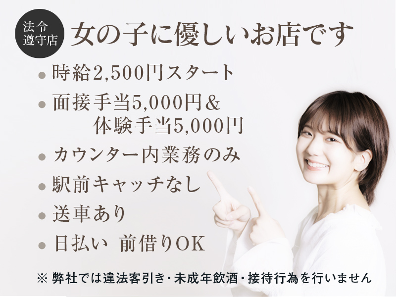 体験入店~お試し期間~研修~入店で、 未経験者さんや不安がある方でもとっても 働きやすいお店なんです